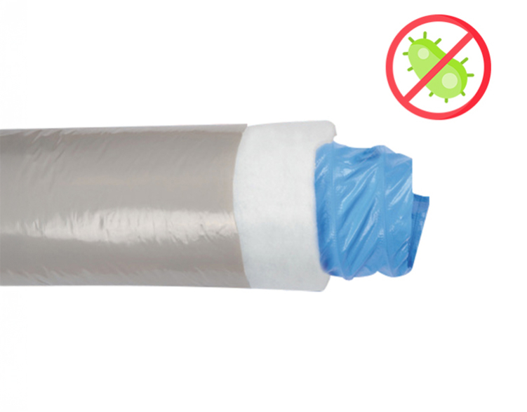 Pre-insulated antibacterial pipe made with internal duct in fabric and insulation in polyester fibers coated with special PVC and external "vapor barrier" coating in polyolefin resins.