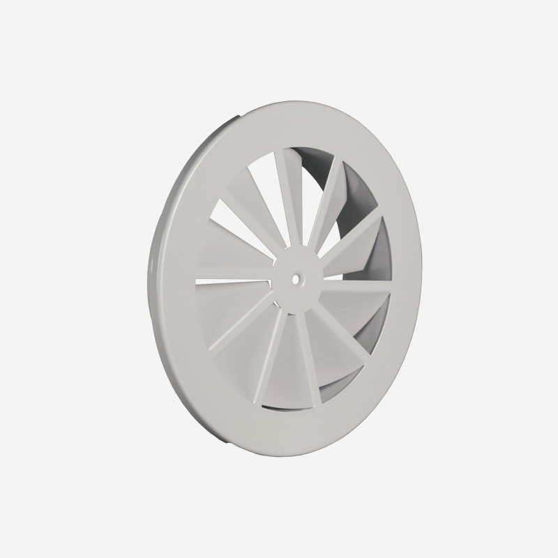 High induction swirl jet diffusers with fixed deflector blades on a circular panel.